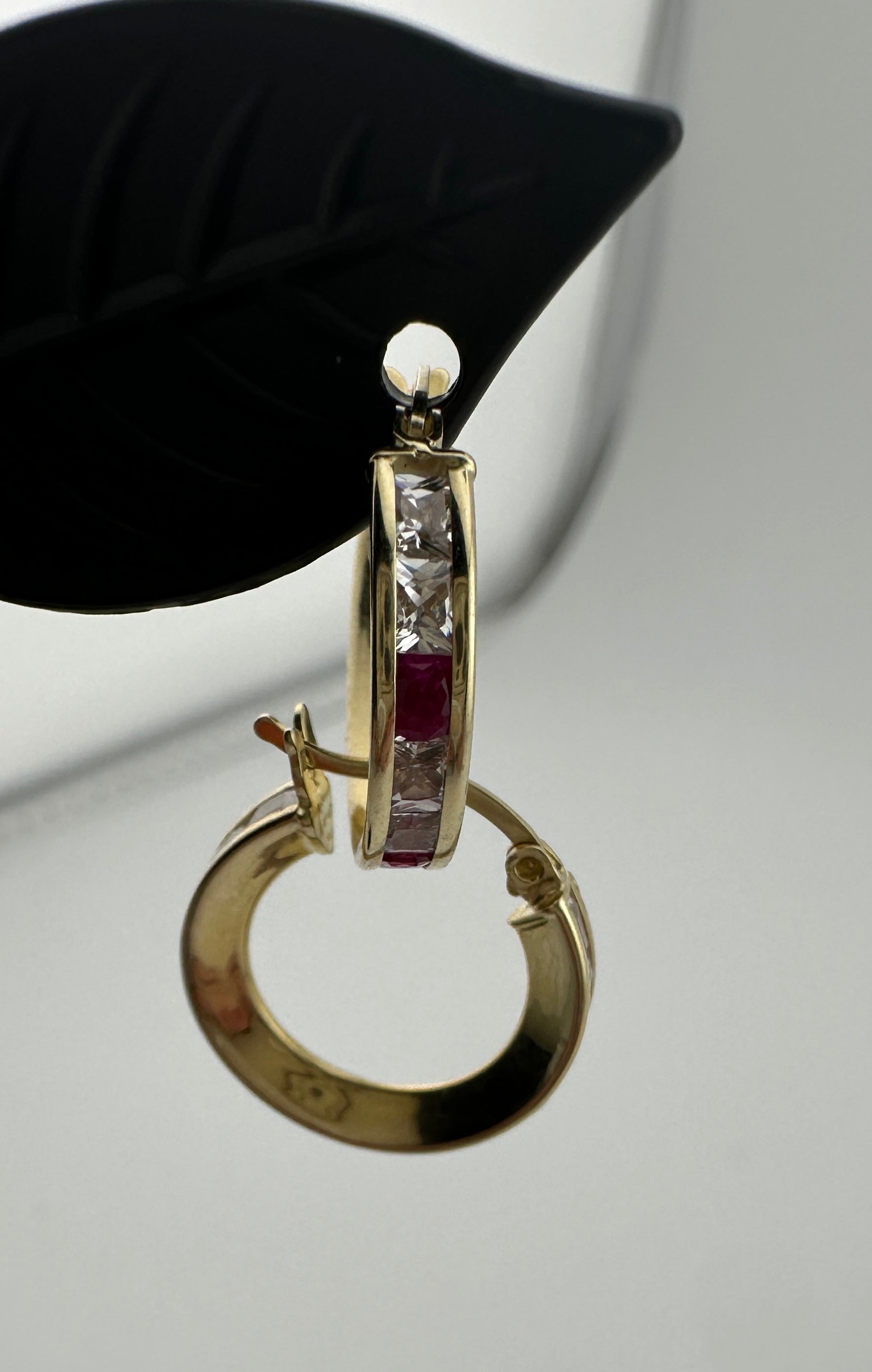 10K Gold Hoop Earrings with Ruby and CZ Inlay